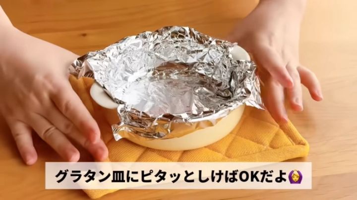 グラタン皿にはアルミホイルを敷いて準備しておきます。