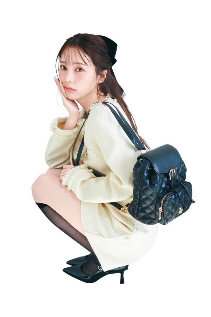 リュック(20.5×20.5×13cm)19,800円/SAMANTHAVEGA(SAMANTHAVEGASHIBUYA109店) ツイードジャケット 16,940円、同ショートパンツ 12,980円/ともにウィルセレクション ルミネエスト新宿店 リボンバレッタ3,300円/idem(アンティローザ)ハイソックス 1,210円/靴下屋(Tabio)パンプス 9,900円/チャールズ&キース(チャールズ&キース ジャパン)
