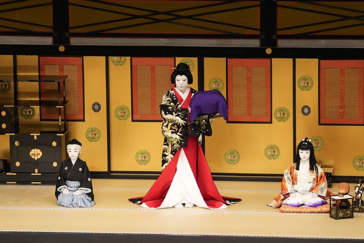 四月の歌舞伎座昼の部『裏表先代萩』は、伊達藩のお家騒動を題材とした物語。三幕目、足利家御殿の場の幕が開くと、琴也さん演じる若君の鶴千代と乳母の政岡(八代目尾上菊五郎さん)、乳母の子の千松(中村秀乃介さん)が舞台に並びます。