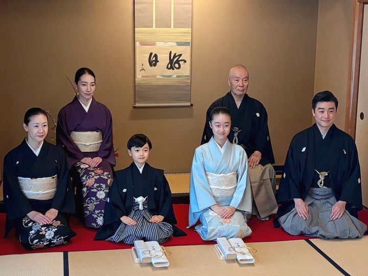 お祖父様の尾上墨雪さん(後列右)、お母様の羽鳥あぐりさん(左)、お父様の菊之丞さん(右)、伯母の尾上紫さん(後列左)、お姉様の尾上椿さん(琴也さんの右隣)と。 写真提供=尾上流事務所