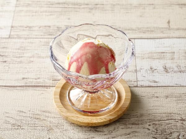 器にバニラアイスをのせて「フルーティス ざくろ」をかける。