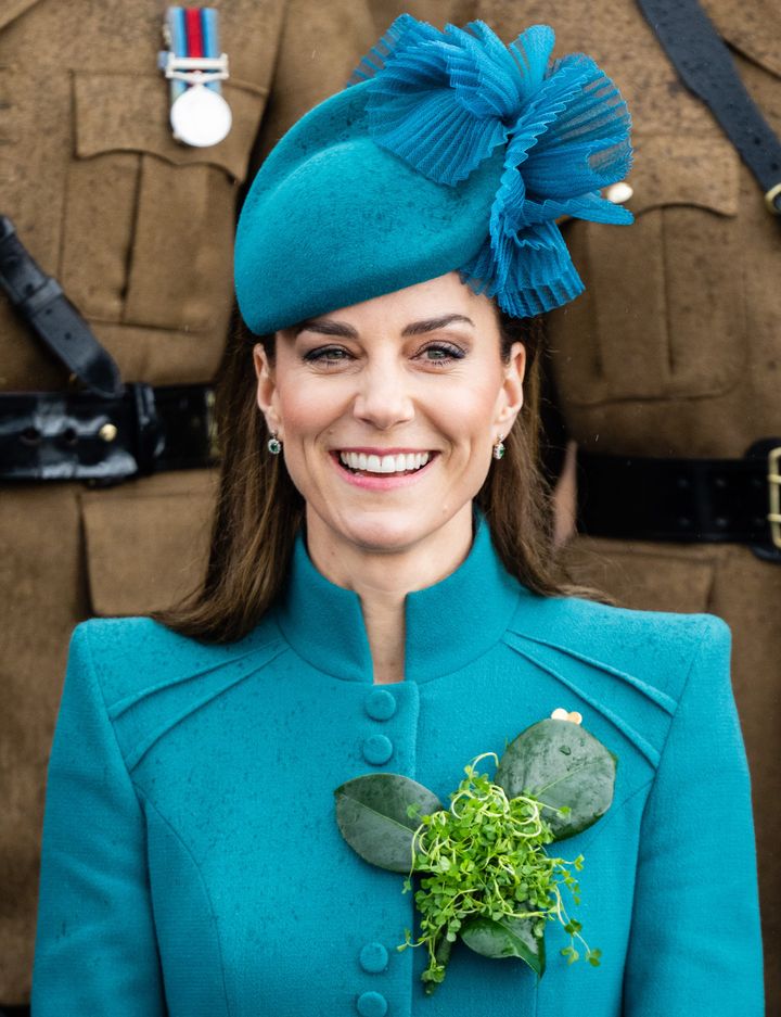 2年前の聖パトリックデーのパレードに出席されたキャサリン妃のお姿。このときのお帽子は、ジェーン・テイラーのものであるだけでなく、ハート型ベースにプリーツの装飾など、デザインもとても似ています。