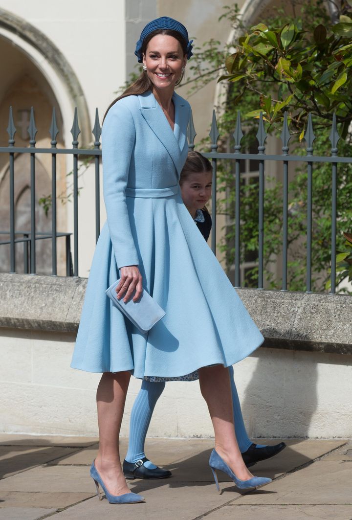 4年前のイースター礼拝でのキャサリン妃ですが、この時ブルーのワントーンコーデの際、キャサリン妃の手に見えるのが、エミー・ロンドンのクラッチで、おそらく色も同じと推測されます。