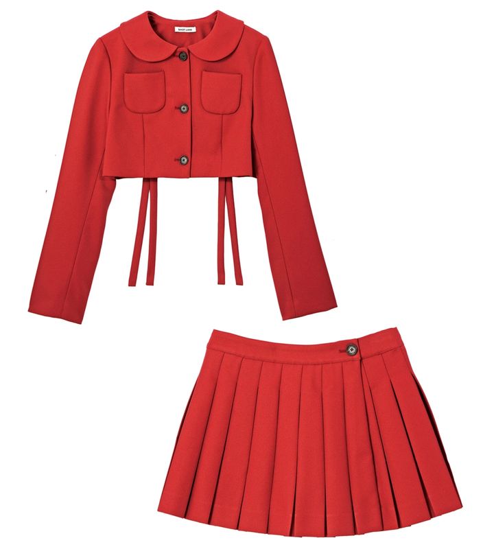 グッドガールな丸襟ジャケットとプリーツスカートを、マイクロ丈でカットした大胆さに視線集中! ジャケット¥93,825、スカート¥87,750(SANDY LIANG/LYDIA)