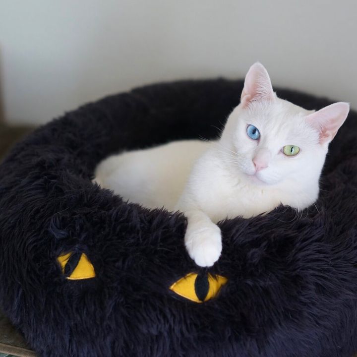 大きな黒ねこのクッションはアイビーのお気に入りの場所。“黒ねこにインする白ねこ”があまりにお誂え向きで、特注ですかと聞かれることもあるのだけど、アイビーを迎え入れるよりだいぶ前に『IKEA』で売られていたもの。ノソノソっとここに入るようになると「今年も秋がきたな」と実感する。この中でリラックスした寝顔を見るのが私にとっては至福の時間で、普段はこの姿が目に入る場所で仕事をしている。