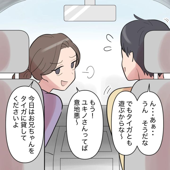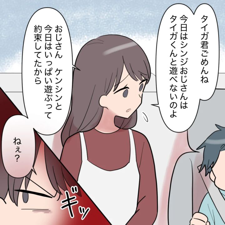 カオルさんたちとの約束のついでに、私とケンシンを遊園地へ誘ったシンジ。それだけでも十分身勝手なのに、今度はタイガ君と2人で遊ぶ約束をして、ケンシンを仲間外れにしようとします。実の子どもよりも妹の子どもを優先して、それがケンシンをどれほど傷つけるのか考えないのでしょうか。