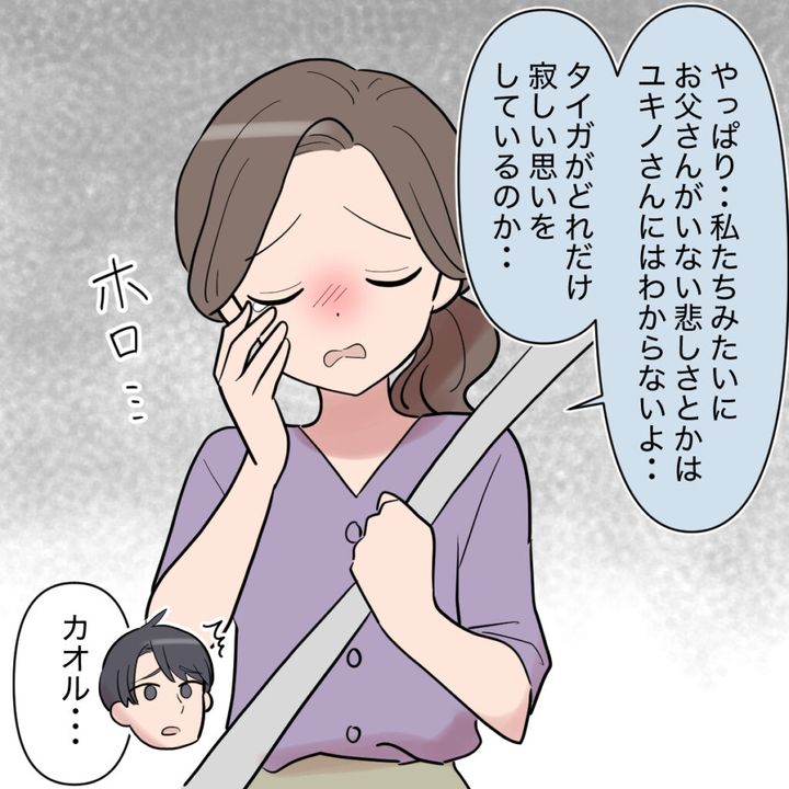 カオルさんは突然目に涙を浮かべると、「やっぱり私たちみたいにお父さんがいない悲しさとかは、ユキノさんにはわからないよ・・・タイガがどれだけ寂しい思いをしているのか・・・」と、しおしおとした様子で言いました。悲しそうな顔をするカオルさんを見たシンジは、「カオル・・・」とはっとした表情を浮かべます。