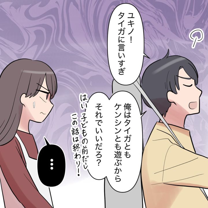 カオルさんの嘘泣きにまんまと引っかかったシンジは「ユキノ!タイガに言いすぎ!俺はタイガともケンシンとも遊ぶから、それでいいだろ?子どもの前だしこの話は終わり」そう言って、強引に話を打ち切りました。