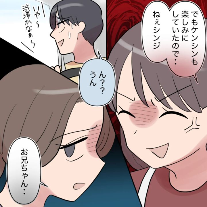 私はふつふつと湧き上がる怒りを必死に抑えながら、「でもケンシンも楽しみにしていたので・・・ねぇシンジ」と笑顔で念押し。ところがシンジは現実から目を背けるように、「ん?うん、いや~渋滞かな~」と必死に話題をそらします。するとカオルさんが「お兄ちゃん・・・」とシンジに声をかけました。