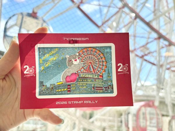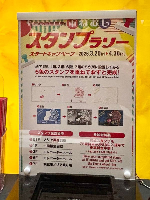 2026年5月3日(日)の開業20周年を記念して、「ノルベサ」が4月30日(木)まで「ノルベサ重ねおしスタンプラリー」を開催。館内5か所に設置されたスタンプを一枚の台紙に重ねていき、1つのイラストを完成させます。完成品を7階の観覧車乗り場に提示することで、料金が半額に!