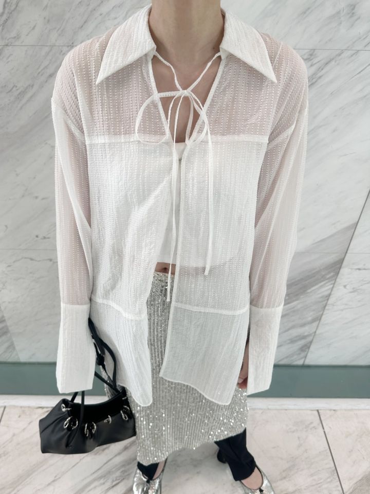 「シアー素材を使ったシャツは通気性がよく、見た目も涼し気な質感。これからの季節でもストレスフリーに羽織れるのが魅力です。フロント部分はリボンとホックで留まる仕様なので、インナーのお洒落まで存分に楽しめるヌケ感のあるデザイン。1枚でスタイリングを素敵に仕上げてくれるアイテムです」シャツ¥17,600(コードエー/CODE Aルミネ新宿店)