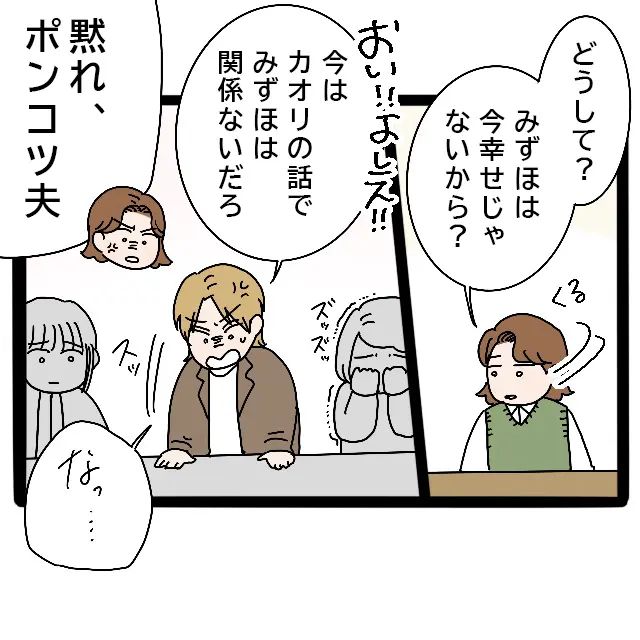 私と隆明の結婚に反対するみずほ先輩に、よっちゃんが「どうして?みずほは今幸せじゃないから?」と尋ねると、思い当たることがあるのか「おい!!よしえ!!今はカオリの話でみずほは関係ないだろ」と兄が怒り出しましたが、よっちゃんは怯むことなく「黙れ、ポンコツ夫」と一蹴。兄は「なっ・・」と口籠ります。