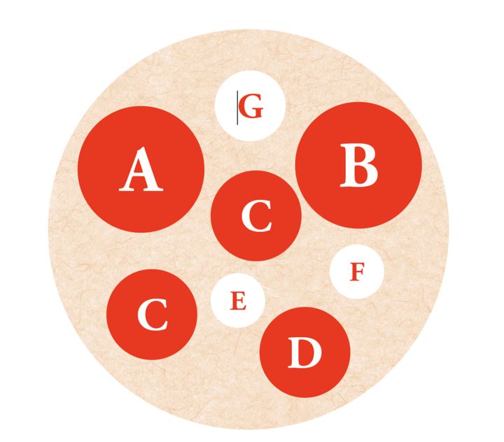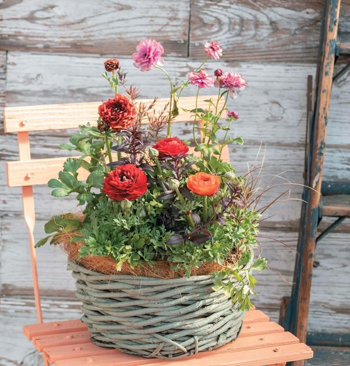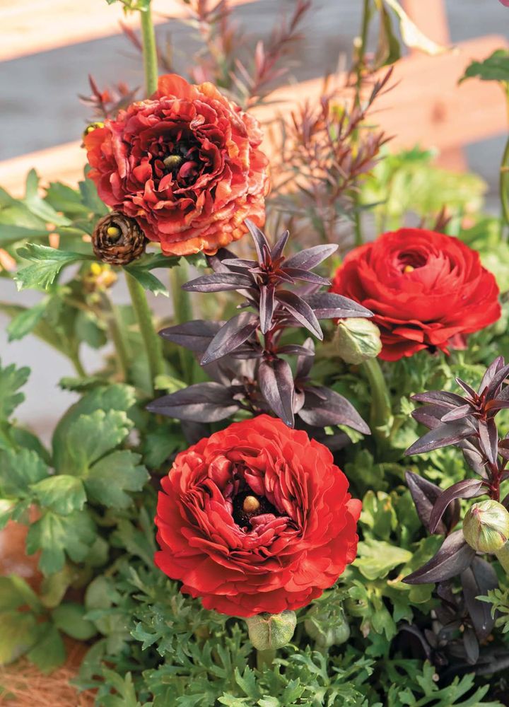 同じ赤系のラナンキュラスでも、個性的なタイプを集めました。定番の花弁が多くぽってりと咲くタイプに、小輪系で八重咲きの ‘ルージュルージュ’ のおしゃれ感、 ‘ラックス’ の茎の先で揺れるような咲き姿などが加わることで、変化のある豪華なバスケットに。葉ものも赤の花に合わせて銅葉や茶系をプラス。あらかじめグレーにペイントした木の枝のバスケットにココヤシファイバーを敷いてから植え込みました。