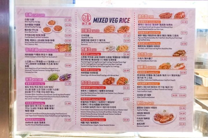 経済飯の価格はお手頃です。場所やおかずにより価格は変動しますが、基本的に3-6シンガポールドルで食べられます。旅行中に予算を抑えたい方に最適です(2026年4月の為替レート換算 日本円にして約375-750円ほど)。ほとんどのお店には、おかずの組み合わせによる価格が表示してあるため、事前におおよその価格を知ることができます。