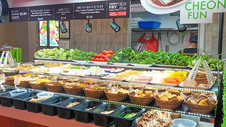 コーヒーショップやホーカーセンターでは、トマト、豆腐、ナス、ゴーヤ、オクラ、キノコ、魚団子、肉団子などなど、さまざまな色とりどりの具材から好きなものをトングで取り、お椀に入れます。基本のスタイルは、先ほど選んだ食材を煮込んでもらい、そこに大豆と煮干しがベースとなるあっさりとした澄んだスープがお椀に注がれるスープスタイルです。