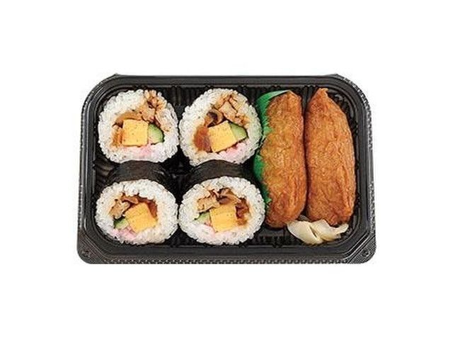 穴子と玉子、きゅうり、かんぴょう、椎茸煮、おぼろを巻いた太巻と、いなり寿司を組み合わせた商品です。太巻は穴子の旨みがしっかりと感じられる味わいに仕上げました。