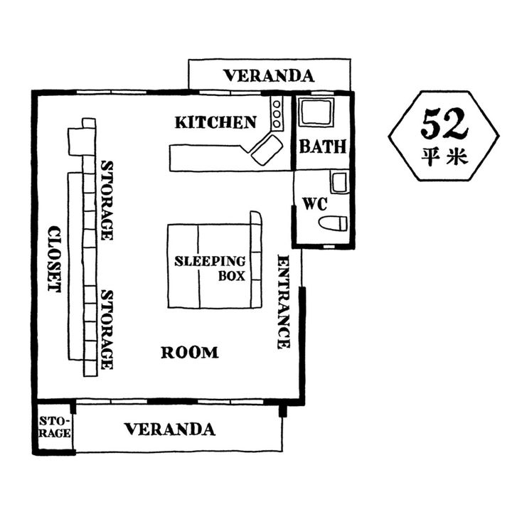 築50年ほどの3DKの空間を壊し、ワンルームに。柱はそのまま残し「スリーピングボックス」と一体化したつくりにした。
