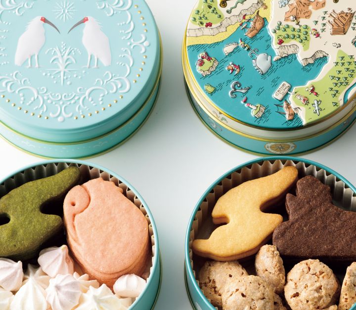 朱鷺缶には佐渡産コシヒカリ米粉入りの朱鷺クッキーや紅白メレンゲ菓子を、佐渡クッキー缶には佐渡島の形のバタークッキーやココアの人面岩クッキーなどを詰め合わせ。