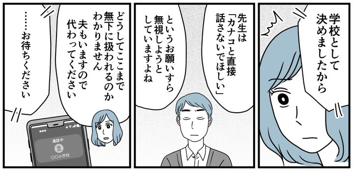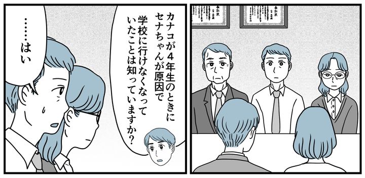 するとその場で、驚くような事実が発覚します。学校側はカナコとセナちゃんの関係について「すでに問題は解決した」と勝手に決めつけていたのです。しかもカナコ本人の気持ちを一度も確認することなどなく……。私たち夫婦はあまりのずさんな対応に呆れてしまったのでした。