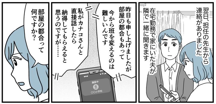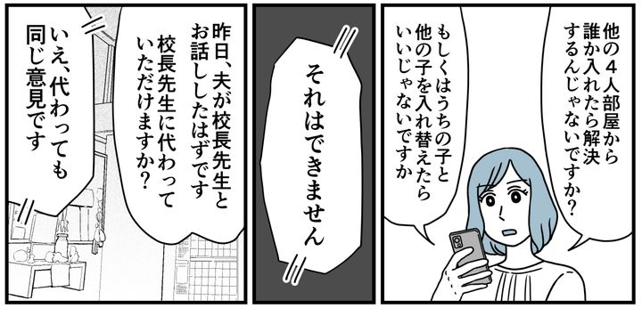 私がどう言っても、担任の先生は「部屋割りは変えられません」と繰り返すだけ。校長先生にも昨日きちんと伝えたのに……。「夫もいますので代わってください」と言うと、担任の先生はしぶしぶと言った様子で校長先生に代わりました。