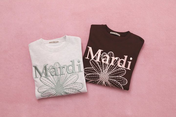 旗艦店・代官山限定スウェットは、ブランドアイコンである「フラワーマルディ」を刺しゅうで表現。各¥16,500/マルディメクルディ(マルディメクルディジャパン)