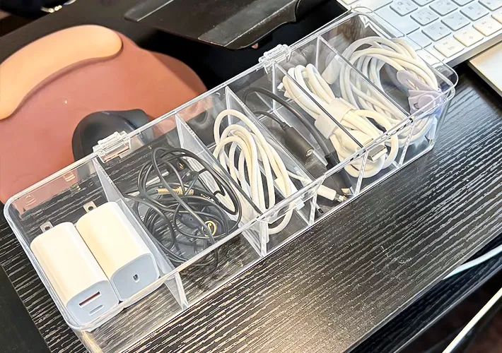 まずは、引き出しの中でごちゃごちゃになりがちな充電コードやイヤホンの収納です。
