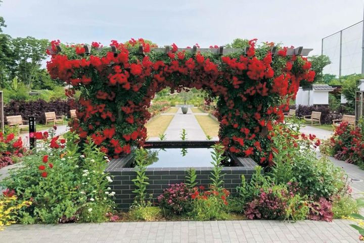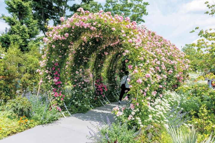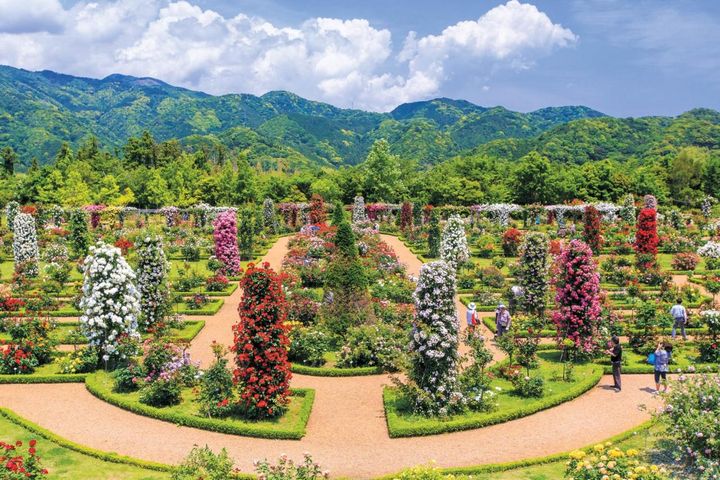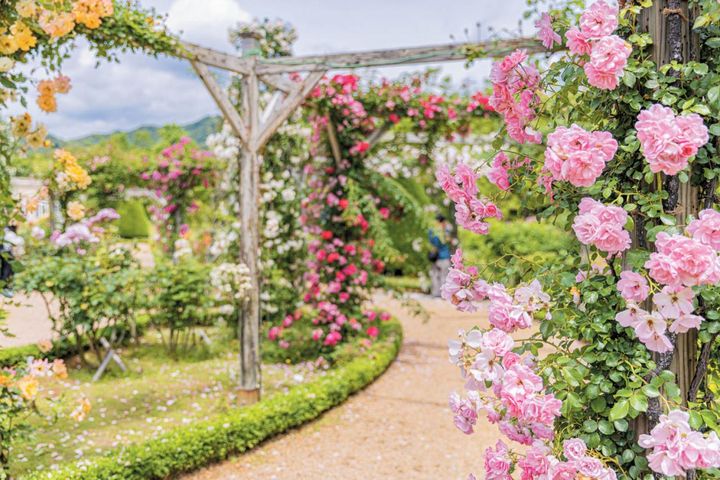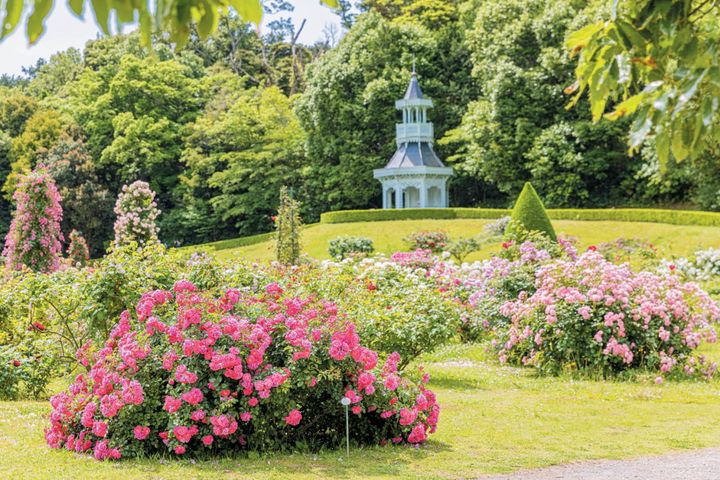 世界各地をテーマに、個性的な11の庭園で構成。7700㎡の敷地に、バラと植物が美しく調和した景色が広がる。写真の他にも、パステルカラーのバラが咲き乱れる「シークレット・ガーデン」、白一色の「ホワイト・ガーデン」など。春バラの見頃は4月下旬~5月下旬。