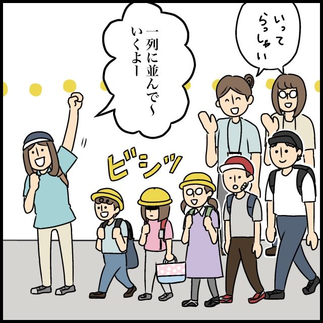 「1列に並んで行くよー」という班長さんの元気な声で、みんなビシッと並ぶ姿に成長を感じるお母さんたちです。笑顔で見送りました。