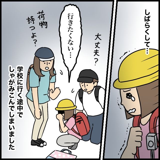 しばらくして、うつむいて歩いていた女の子が、涙をポロポロ流し始めました。「行きたくない」そう言って、とうとう通学路の途中でしゃがみ込んでしまいました。班長さんは「荷物持つよ?」と、副班長さんも「大丈夫?」と優しく声をかけましたが、女の子が泣き止む様子がありません。