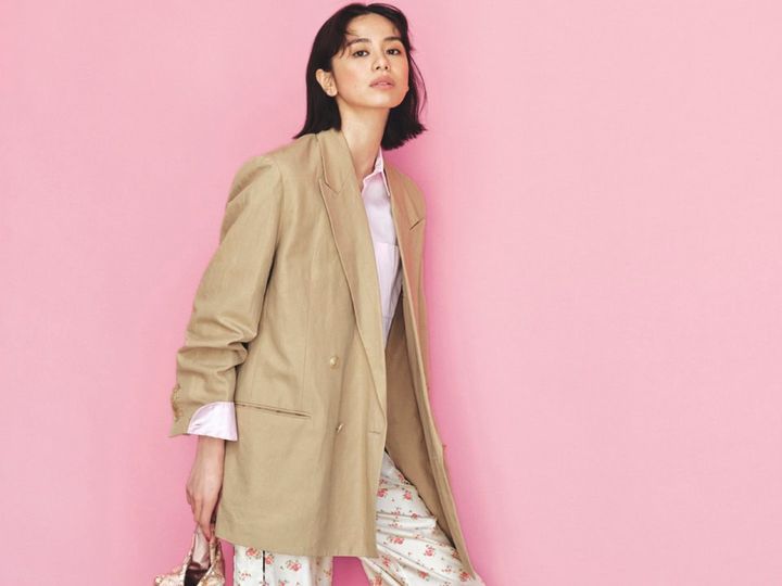 ジャケット¥134,200(バウト)、シャツ¥66,000(マディソンブルー)、花柄パンツ¥138,600(ラ プレスティック ウィストン/サロン アダム エ ロペ)、サンダル¥156,200(ジャンヴィト ロッシ/ジャンヴィト ロッシ ジャパン)、バッグ¥17,600(ヴィスク/S&T)