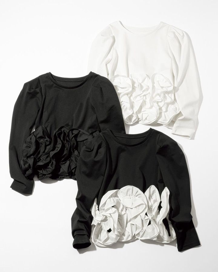 肩にタックを入れ、立体的なシルエットに仕上げた袖は、腕のラインを綺麗に見せながら自然なふんわり感を演出。ノーカラーのすっきりとした首まわりとショート丈で、ボトムとのバランスも取りやすくなっています。最大のポイントは、裾にたっぷり施された大きめフリル。存在感がありながらも甘すぎず、一枚でコーデがぐっと華やかに決まります。デイリーはもちろん、お出かけやちょっとした集まりにもぴったり。シンプルな中に可愛らしさと品の良さを合わせ持つ、大人フェミニンなプルオーバーです。