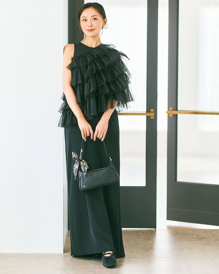 ドットチュールを贅沢に重ねたケープがアクセントのマキシドレス。ケープは肩にかけて華やかさを添えたり、片側に寄せてアシンメトリーなニュアンスを作ったりと、アレンジを楽しめます。ドレスは落ち感のある生地を使用し、シワになりにくく扱いやすいのも魅力の一つ。ミニマルなノースリーブデザインで肩回りを華奢に見せてくれます。ボリュームのあるケープとは対照的に、ボディラインを拾いすぎないすっきりとしたIラインシルエットがメリハリのあるバランスに。肩にかけて華やかに、ビスチェのように巻けばデイリーに着られるドレスは落ち感のある生地を使用し、シワになりにくい。