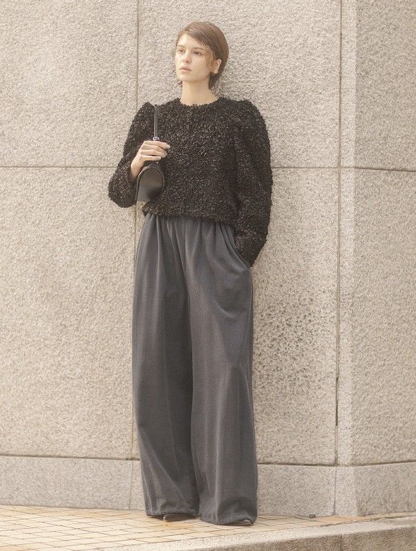 【POINT】カーディガン感覚で羽織れるノーカラーの軽やかさと、黒がもたらす静謐な強さ。一見ドレッシーなレースを、あえて真逆の質感であるスウェットパンツで「ハズす」のが今季の正解。コンパクトな丈感はワイドボトムとの相乗効果でスタイルアップを約束し、程よくゆとりを持たせたそでが、動きやすさと今どきなニュアンスを同時にかなえてくれる。