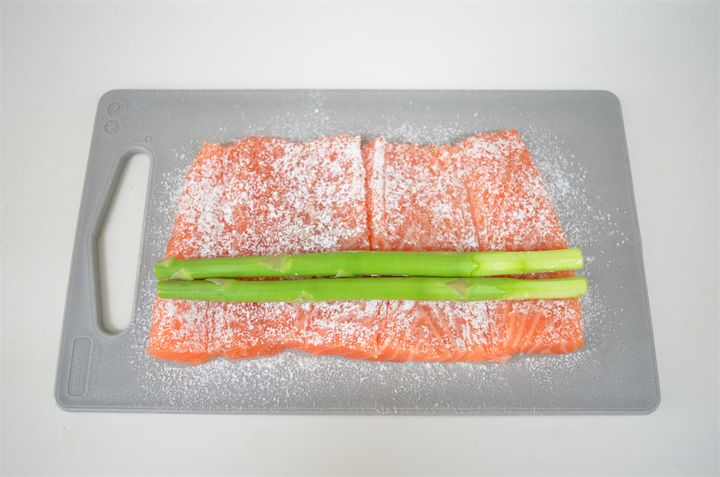 2. アスパラは下3cmを落とし、硬い部分をピーラーで削ぐ。鮭の横幅に合わせて穂先を切る。鮭に小麦粉をはたいてアスパラを巻いたら、ラップで包む。切った穂先は塩茹でにする。