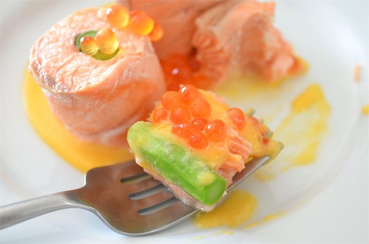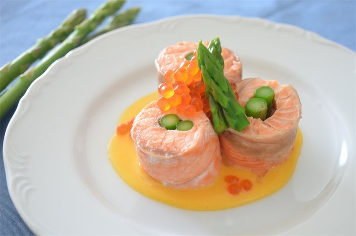 おいしすぎる「鮭のアスパラ巻き 黄身ソースいくら添え」。