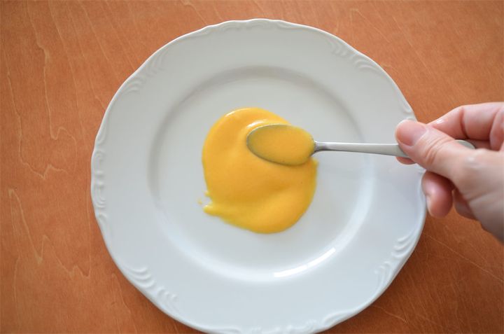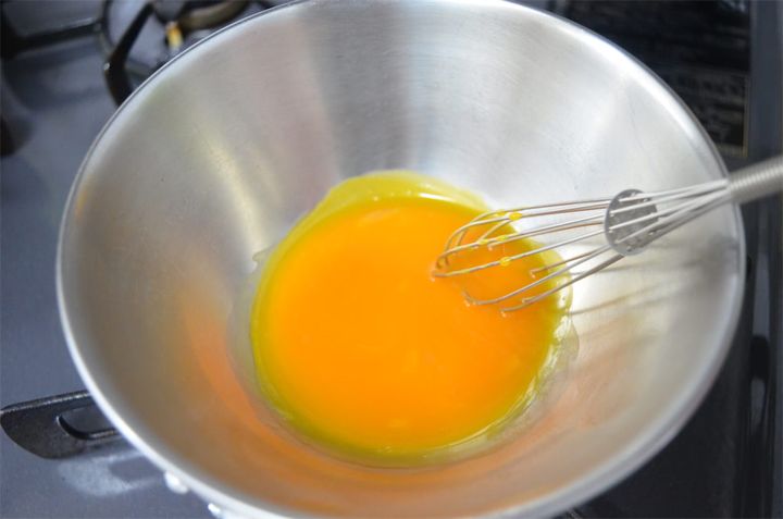 4. 黄身ソースを作る。バターを600Wの電子レンジで30秒加熱して溶かす。卵黄を鍋に入れて弱火で湯煎し、溶かしバターを少しずつ入れて馴染ませる。ぽってりするまで火を通す。