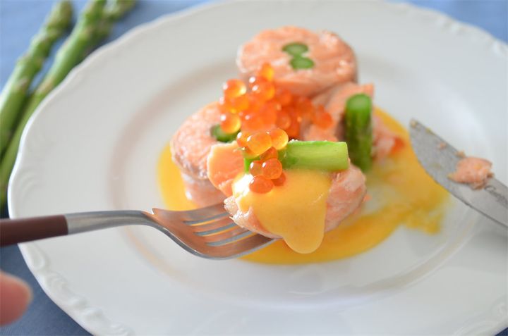 濃厚ソースがたまんない♡「鮭のアスパラ巻き 黄身ソースいくら添え」