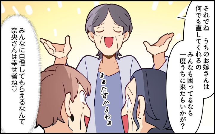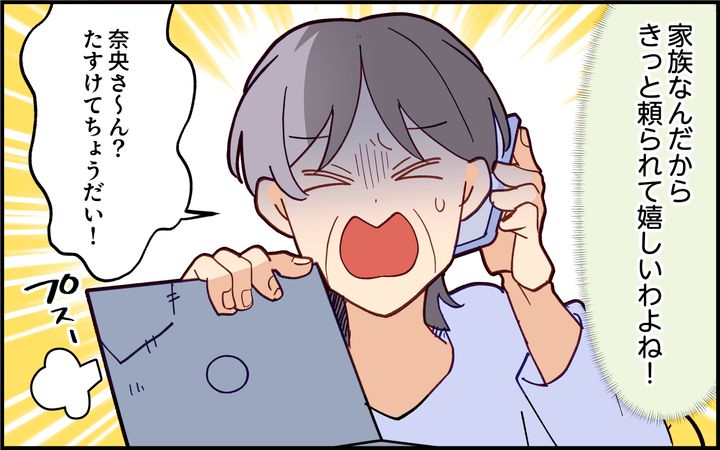 IT企業勤務というだけで、機械オンチの義母に便利屋のように呼び出されていた奈央。育児に専念するためスルーすることを決めるが、ケガをしたという呼び出しで慌てて義実家に行くと…。それが嘘だとわかり、奈央は爆発するのだった。