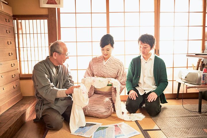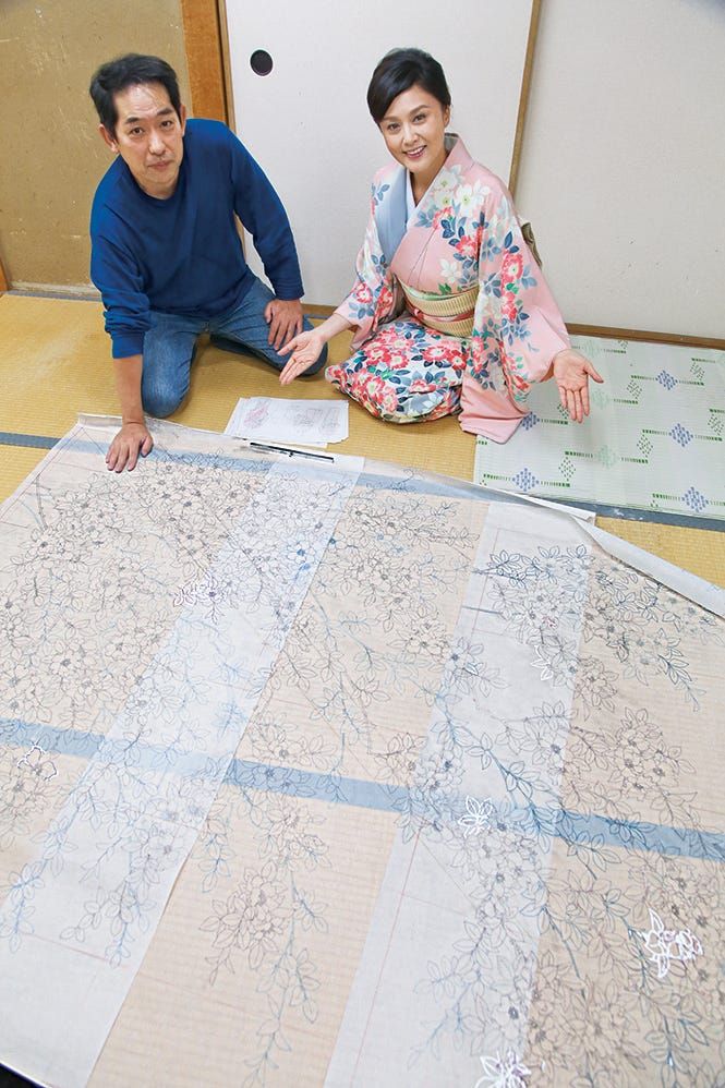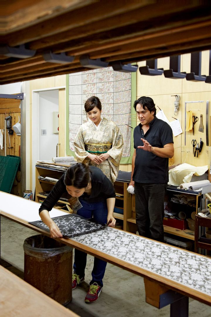 今回は、京都市右京区の太秦(うずまさ)に立つ、濱本信博さん・拡玄さん親子が友禅染の美をつなぐ「濱本工房」へ。数ある難しい工程の一部を見せていただきながら、お2人の話に耳を傾ける藤原さん。「着物は日本の宝ですね」と話します。