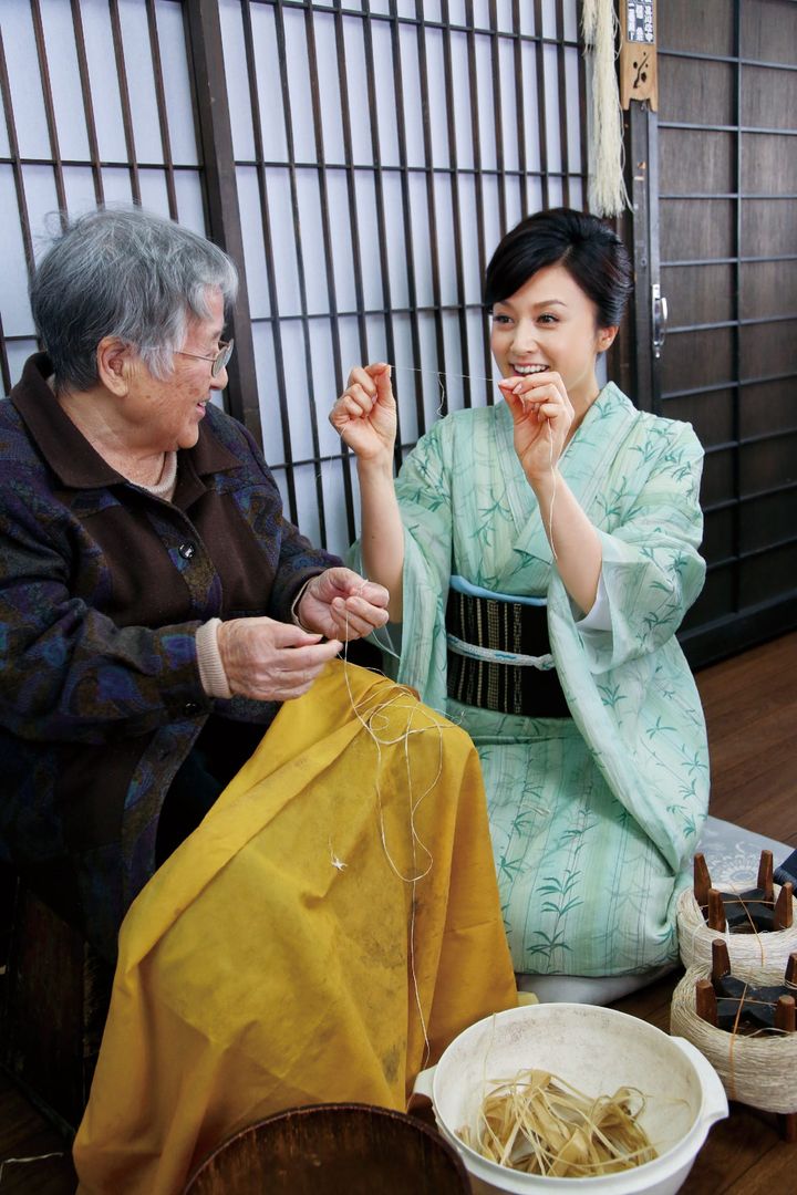 新潟県小千谷市にある老舗縮問屋「西脇商店」と自然素材を用いた帯の制作に取り組む「織田工房」を訪ね、楮の糸績みや、小千谷縮の品質を左右する「湯もみ・シボ取り」の作業を体験。作り手の思いがこもった着物や帯をお召しの藤原さんは大感激の様子。