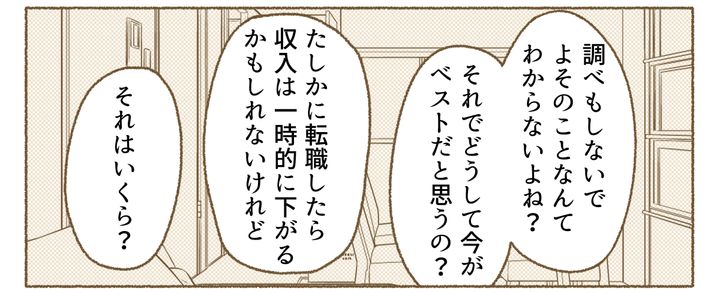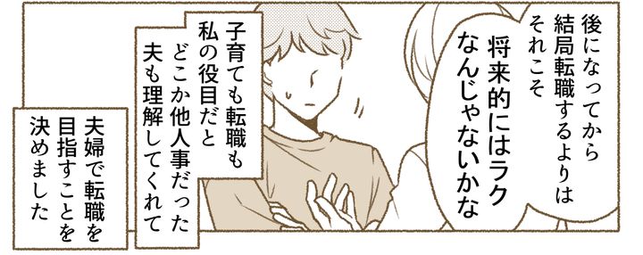 夫は私がこの話をするまで、子育ても家事も転職もすべて私の役目だと思って、だからどこか他人事だったのだと思います。でも私の話を聞いて、転職も子育ても私だけの問題ではないことにようやく気がついたようです。
