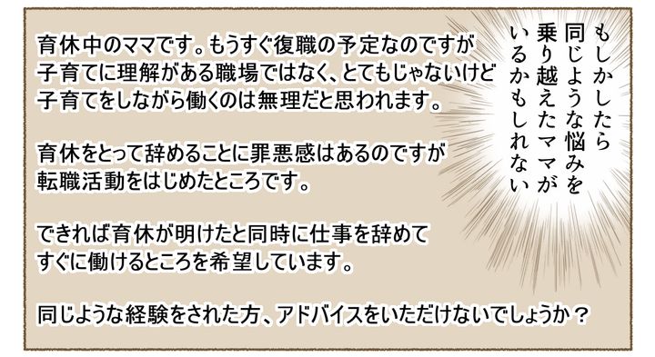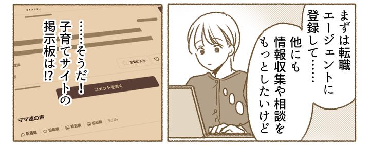 <職場復帰、ムリ~!>夫婦ともに転職を決意。掲示板で先輩ママにも相談してみよう!【まんが】