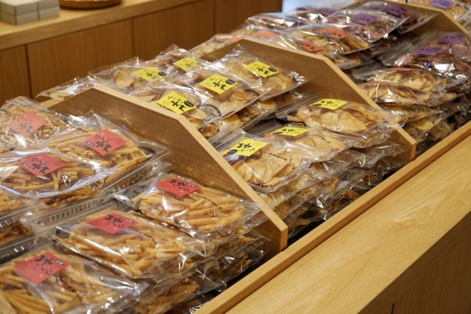 揚げたて・焼き立て・生菓子のほかにも、個包装の『芋けんぴ』『芋チップ』がずらり。