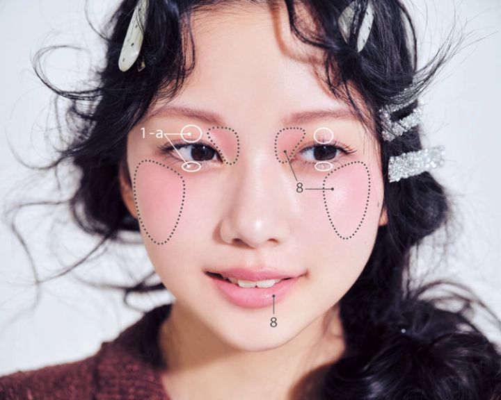 1-aを黒目をはさむように上下まぶたに小さくポイントでのせる。