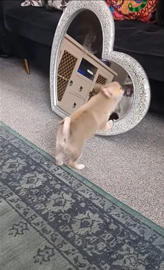 ・・・それは、鏡に写る自分の姿に驚いたから! 訝しげな様子で距離を保ったり吠えかかったりしています。 生まれて初めて鏡を見たというこの子は、自分の姿を見るのも初めて。