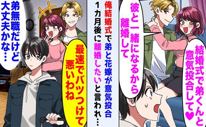 理由を問い詰めると、妻の口から信じられない言葉が飛び出しました。「実はね、結婚式であなたの弟くんと意気投合しちゃって♡ 早速こんなこと言って悪いんだけど、弟くんのほうが顔も収入もいいし……彼と一緒になるから離婚して」