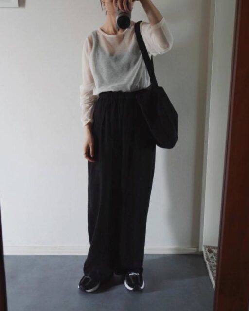 黒シアープルオーバー×白のロングスカート・ワイドパンツのコーデ