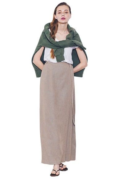 ポイントはベージュの「色味」。グレーのようにも、ブラウンのようなイメージでも使える、涼しげで淡いベージュよりも引き締まって見えるサンドベージュを選択。ロングスカートにカーキスエットを肩掛けしたドライな配色。細身のスカートと、デコルテをキレイに見せる白Tで女性らしく。