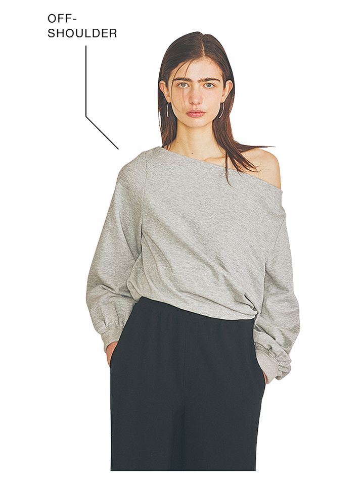 「鎖骨をシャープに映し出すルーズなオフショル」