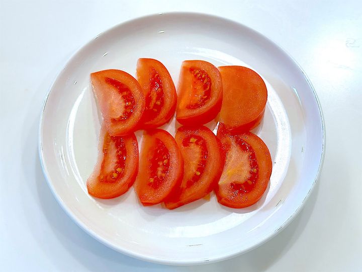 3. トマトは薄めのくし切りにする。
